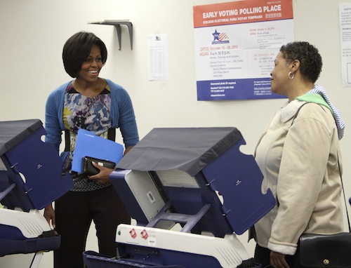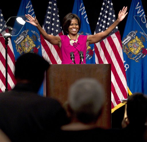 For this event Michelle Obama chose to wear a Donna Karan draped halter dress (see here) in a rich, charcoal color. Her hair was pinned up in a chic, pompadour bun, and she completed her look with a chunky necklace designed by Erickson Beamon (also the designer of many of Michelle’s chunky, statement belts). Dr. Biden also looks quite fashionable, wearing figure-flattering dress with cow neckline and accented with a brooch. Perhaps she has upped her look in order to compete with the iconic style of Michelle? We all know Michelle was the first to add the brooch to a simple frock.